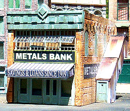 Description: This beautifully detailed old bank is literally bursting with character. It features richly detailed hydrocal castings, laser cut doors and windows, full color signs and awnings, printed, pre-rusted corrugated siding and complete easy-to-understand assembly, painting & weathering instructions.