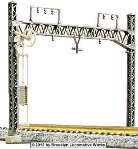 Set includes 6 sets with bases for ground level use and wire tensioner details. While not a 100% match, this is similar to the catenary poles used by the New Haven. Track is NOT included. |