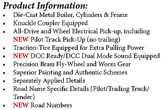 | Please note: all photos are of previous run Model Power locos. They are used for illustration purposes only. New production will feature knuckle type couplers, as well as mechanism and paint scheme modifications / upgrades. |