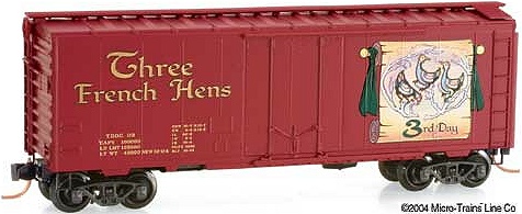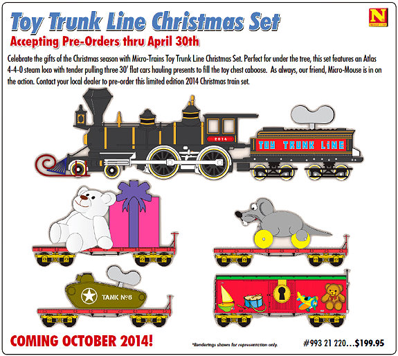 After receiving many requests, Micro-Trains will be offering the Truck Line Christmas sets in Z scale. Reservations for the Micro-Trains 2014 Christmas Z scale set are now open. The "Toy Trunk Line" set features an F7 locomotive pulling 3 30' flat cars with "toy" loads and matching caboose. This is a different offering from the usual fare and sure to be a real attention getter. |