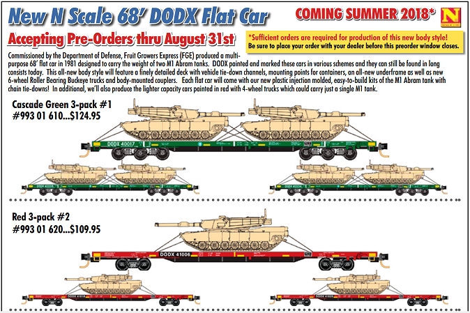 To reserve these exciting new Micro-Trains DODX series flat cars with expected delivery starting in the summer of '18 -- please click on the link below to be directed to the order / reservation page on the hogtrains.com web cite.