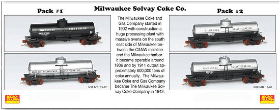 With the release of Kato's superb new Milw Rd. Hiawatha Set, The Milwaukee Road is really hot. Don't miss your chance to add this attractive new Express Box Car (or the discontinued Milwaukee Solvay Coke Tank Cars, below).