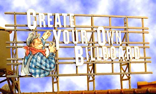 Latest from Bar Mills is a "Billboard in a Bag" Kit. Includes 4 injection molded plastic billboards, leg bracing assemblies, photo-etched alphabet set -- you can create any billboard message you want! Also includes non-operating "lights" and full color poster signs with instructions/tips. Kit will yield a total of 4 complete billboards.