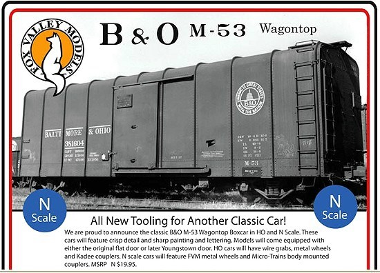 Note: Fox Valley has announced a new run of the N Scale B&O Wagon Top Box Cars for delivery in the 4th Quarter of 2016. Your shopping cart will show a "free" zero