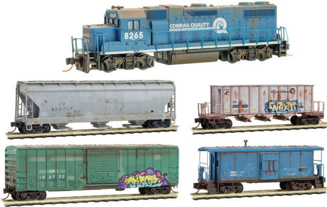 Limited in quantity, this set features a Walthers (Life-Like) Conrail GP-38 diesl which has been appropriately weathered, along with 4 Micro-Trains cars, all weathered. Two also feature graffiti.