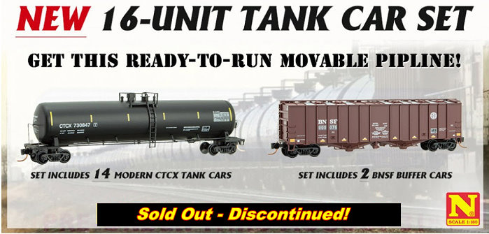 Now in stock is this impressive 16 Unit Train Set which includes 14 Tank Cars plus 2 BNSF Airslide Buffer